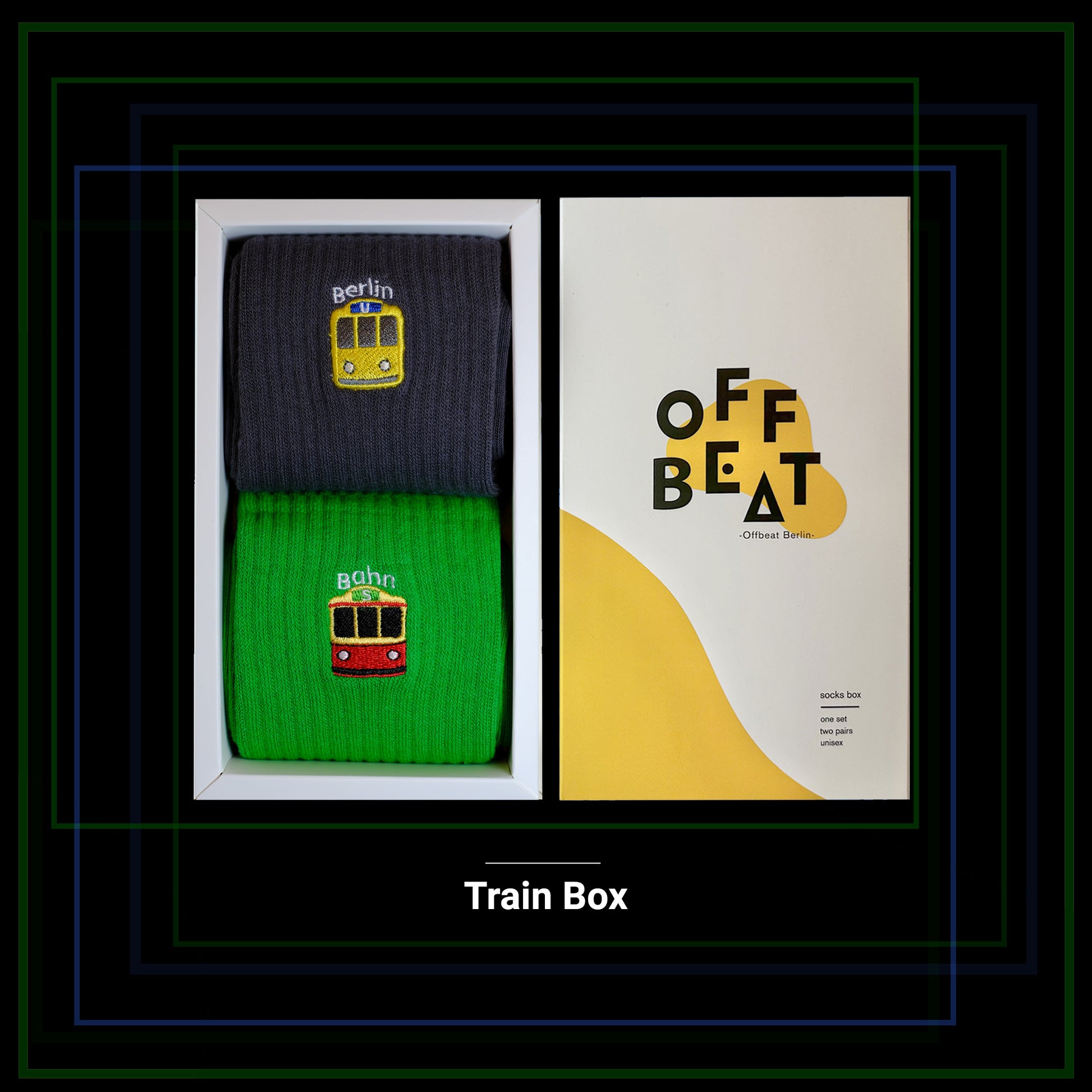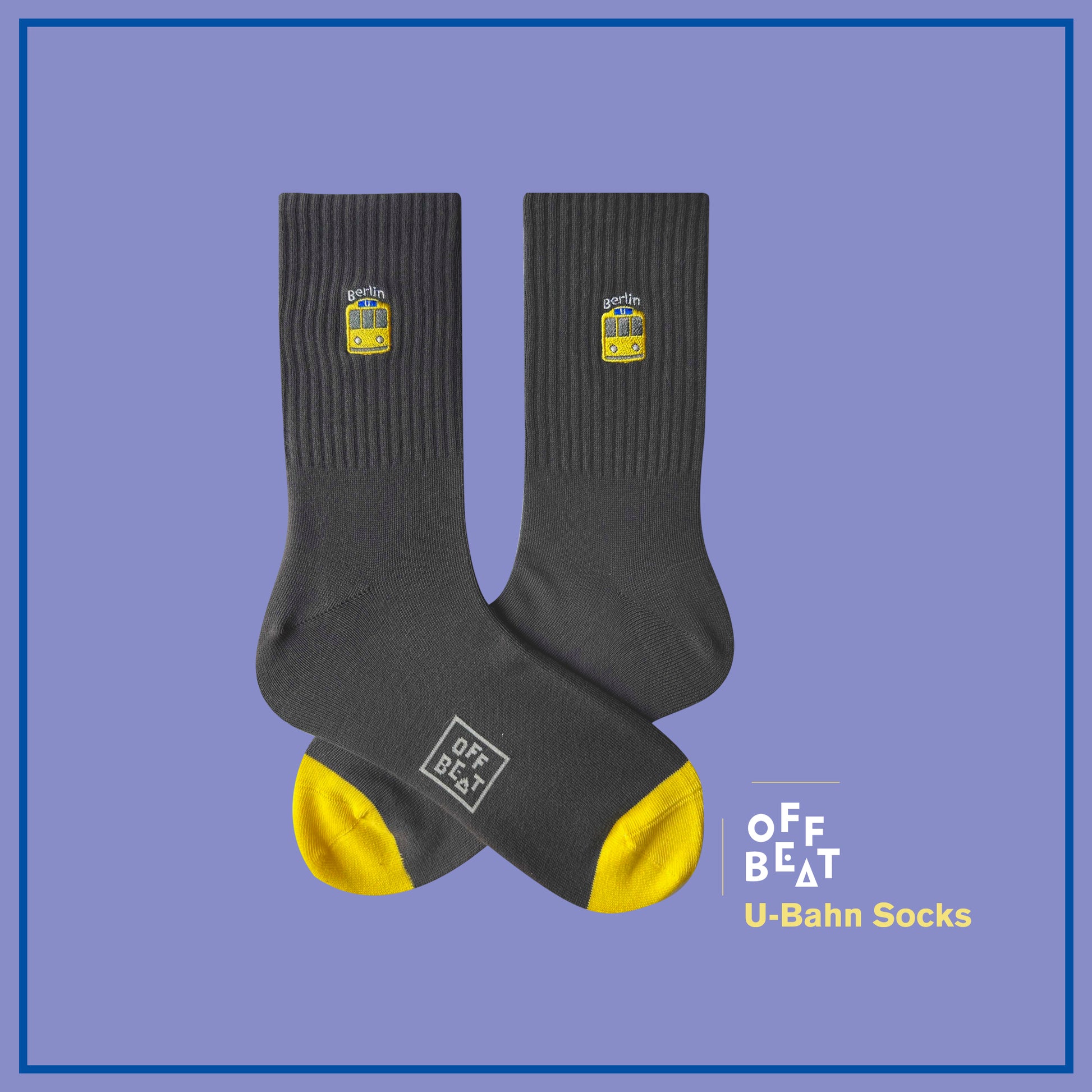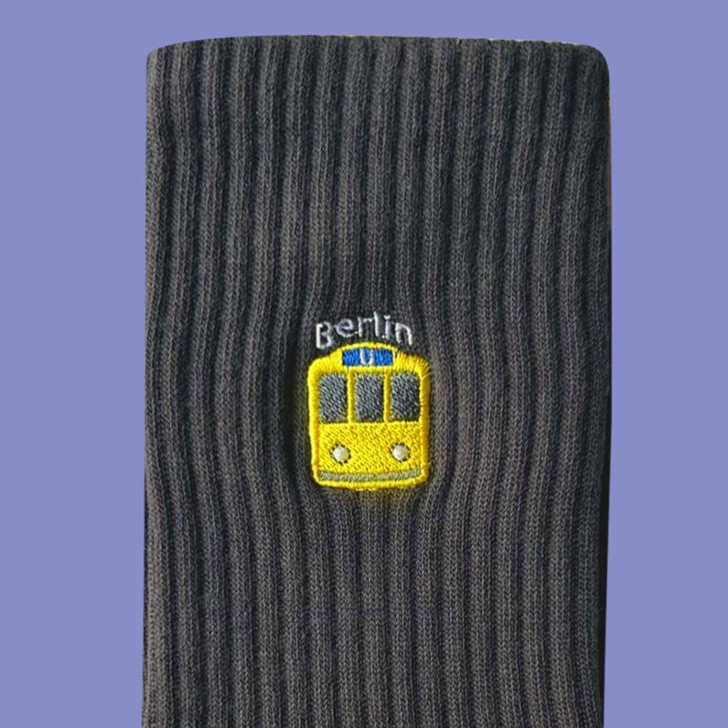 A pair of understated dark gray socks, accented with a striking bright yellow subway train head—This is an absolute must-have fashion piece for any subway enthusiast!